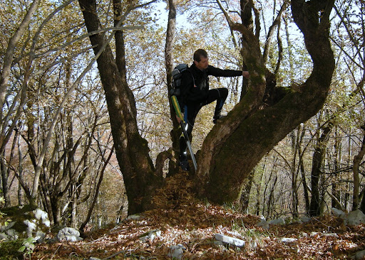 Teren in s tem sam dostop mi je bil poznan že od prej, velika neznanka pa je bil sam hrib Trstenik. Ma ni bilo problema ga najti. Večja težava je bila, da ni nobene poti, niti steze, pa magari od divjadi, proti vrhu. Tako živemu človeku ne preostane drugega kot, da zapusti kolo ob kakšni markantni skali in jo piči naravnost in navzgor. Kaj dosti ne moreš falit. V nebesa itak ni prišel še nihče. Vsaj povedal ni, no! In tako, žalostno zapustim moje zvesto kolo ob eni veliki beli skali, naredim par korakov, obesim čelado na vejo, pa še sto metrov navzgor in na vejo obesim levo rokavico, pa še sto metrov in še desno, malo pod vrhom zmanjka rok in s tem rokavic zato se jima pridruži še podkapa, ki ponavadi nabira znoj. Pot je začasno markirana in ni strahu, da bi ob povratku zgrešil svojega konjiča. V resnici sem kasneje porabil več časa z iskanjem rokavic, kot pa z iskanjem bicikla. Kaj čmo!