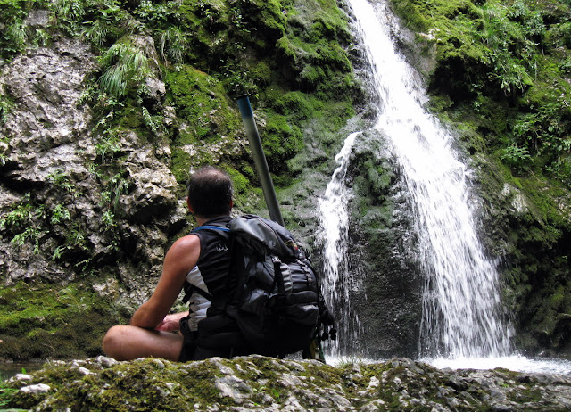 Ob prvih zvokih vode zavijem desno in že takoj sem na stezici, ki pelje visoko nad grapo. Tu ni časa za napake med vožnjo. Vsaka neumnost bi bila poplačana s kotaljenjem do potoka, ki je nekje tudi 40m globoko. Predvsem je izpostavljen krajši 50m del tik nad 27m visokim slapom Pršjak. Tu je steza vklesana v steno in na tem mestu je MTB kanjoning zelo nezaželen. Adrenalin nabijem v višave in se spustim po njej. Enkrat, dvakrat, trikrat. Zakaj tolikokrat? Zato, ker tudi kamera zahteva svoje posnetke in me sili v ponavljanje adrenalinskega vložka.