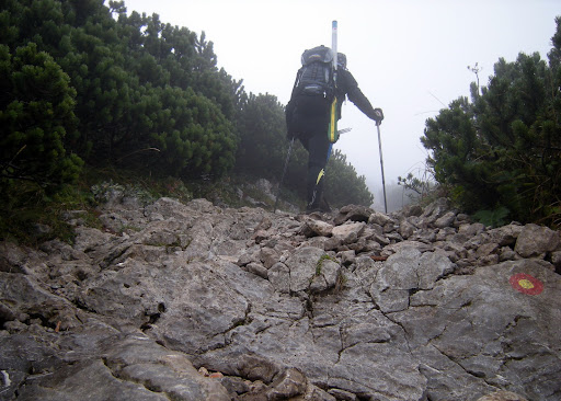 S štirikolesnikom sem se pripeljal do Okroglin, presedlal na dvokolesnika in se potem nekje na višini 1500m preobul v planinske čevlje, ki sem jih do tedaj tovoril na rucaku, poleg vse ostale elektro in reševalne šare. Zadnjih 300vm vzpona je minilo zelo hitro, saj je bila vidljivost le okoli 10m in nisem vedel ne kje sem, niti koliko imam še do vrha. Saj ni treba razlagat, da sem bil prvič na Snežniku, kajne? In prosim: ne govort naprej! No, takoj, ko sem zamenjal kolesarske balerinke s tem kmetavzarskim obuvalom opazim, da je temperatura že padla na 2C. Plusa!